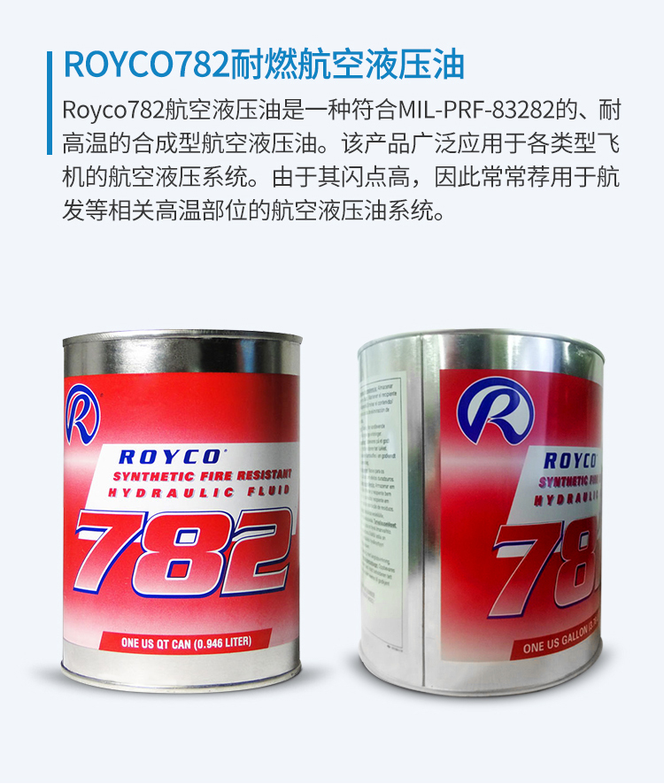 Royco782航空液壓油是一種符合MIL-PRF-83282的、耐高溫的合成型航空液壓油。該產(chǎn)品廣泛應(yīng)用于各類型飛機(jī)的航空液壓系統(tǒng)。由于其閃點(diǎn)高,因此常常薦用于航發(fā)等相關(guān)高溫部位的航空液壓油系統(tǒng)。