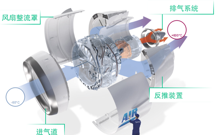 在飛機的動力系統中,大家見到最多的就是飛機短艙系統,也就是包裹在航空發動機外面的白色圓筒。這個部位由進氣道、風扇整流罩、反推裝置、排氣系統四大部分組成,它為發動機工作提供所需工作環境,可以說是發動機的房子。